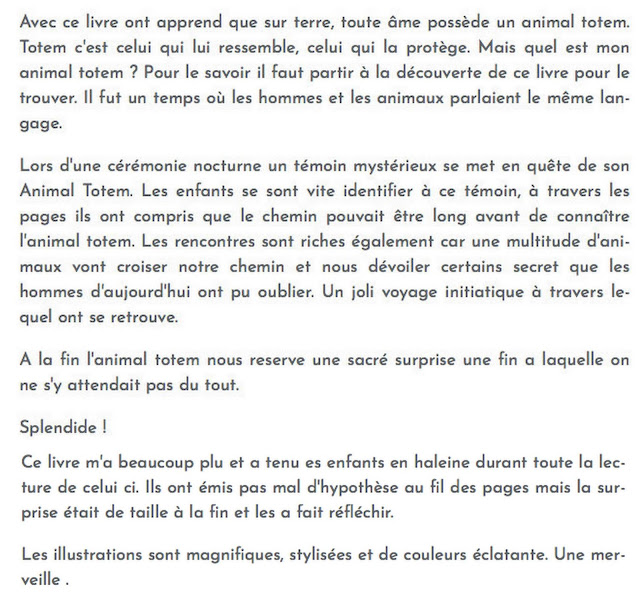Le Totem draîne la même idée, mais il est l’emblème de tout un groupe. Une vérité supérieure à celle d’un individu isolé qui découvre qu’il appartient à un ensemble, et que cet ensemble est doué de vie. Et comme le totem est la plupart du temps un animal, il souligne que le groupe est autre, une réalité obscure à nos sens, un instinct puissant aussi, qui balaye nos mauvaises raisons : trouver son Totem, c’est aussi définir l’humanité à laquelle nous appartenons.« Quel est ton animal-totem ? » la question court tout du long de ce récit souriant et empreint de gravité devant la nature et ses mystères, dans ce nouvel album des éditions HongFei Cultures.