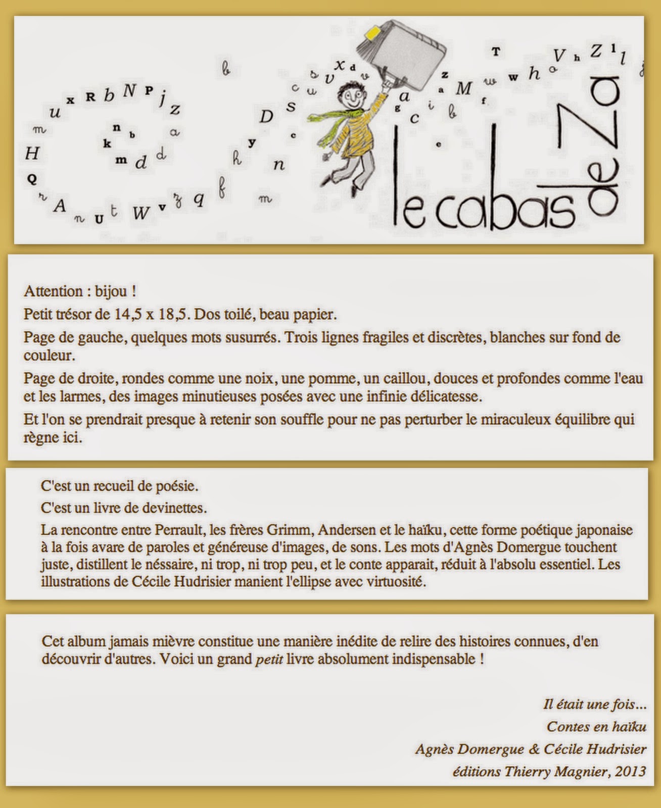 Agnès Domergue est musicienne professionnelle, mais également passionnée de littérature jeunesse. Elle s’est lancée un défi : « résumer » les grands contes, les principales histoires de la mythologie et les fables de La Fontaine sous forme de haïku ! Ce pari difficile et audacieux est pleinement réussi dans ces trois ouvrages intitulés Il était une fois… publiés aux éditions Thierry Magnier : pour chaque recueil, la même mise en page avec à gauche le haïku et à droite une illustration délicate, mélange de traits fins et d’aquarelle de Cécile Hudrisier.